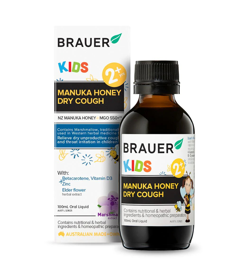 With added Vitamin D3, Betacarotene and Zinc, Brauer Kids Manuka Honey Dry Cough supports healthy immune system function in children.