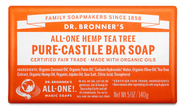 Woodsy and medicinal, our Tea Tree Pure-Castile Bar Soap contains pure tea tree oil—good for acne-prone skin and dandruff! Dr. Bronner's Pure-Castile Bar Soap is made with certified fair trade ingredients and organic U.S.-grown hemp seed oil for a soft, smooth lather that won't dry your skin.