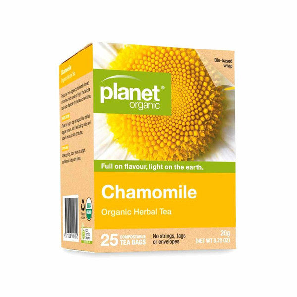 Planet Organic Chamomile Herbal Tea is produced from organic chamomile flowers of certified herb gardens. Enjoy the delicate taste and character of this classic herbal tea.